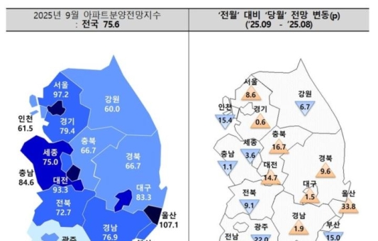 [뉴스앤저널] 9월 전국 아파트 분양전망지수가 전월 대비 소폭 상승하며 75.6을 기록했다. 서울과 울산은 뚜렷한 개선세를 보였지만, 인천과 광주는 큰 폭의 하락세를 나타내며 지역...