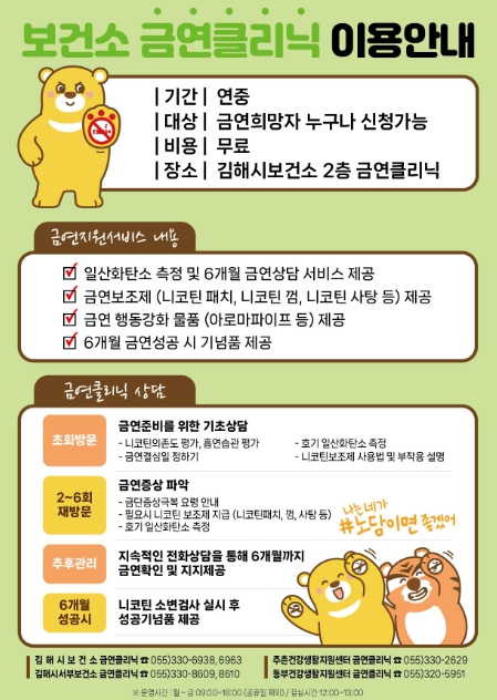 김해시보건소 2층에 위치한 금연클리닉은 평일 오전9시부터 오후6시까지 운영하며 금연을 희망하는 시민 누구나 이용 가능하며 김해시보건소 내소가 어려운 시민들은 김해시서부보건소, 동부건강생활지원센터, 주촌건강생활지원센터도 내소하여 상담이 가능하다.