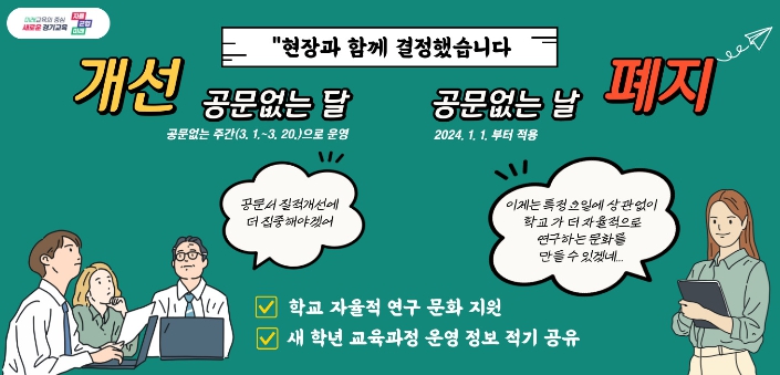 지난해 ▲권역별 협의회 ▲찾아가는 학교업무 지원 현장 협업 모니터링 ▲학교업무개선 TF팀을 운영한 결과, 현장에서는 ‘공문없는 날(달)’에 대해 정책 효용성이 떨어지고 개선이 필요하다고 제안했다.