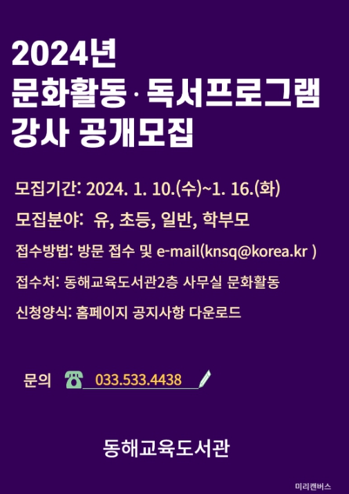 지원 방법은 동해교육도서관 홈페이지에 양식을 내려받아 1월 16일까지 2층 사무실로 방문, 또는 이메일로 제출하면 된다.