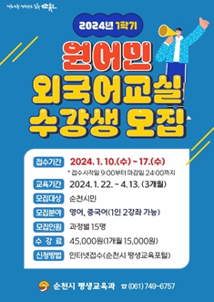 ![]() 순천시, 2024년 1학기 원어민 외국어교실 수강생 모집 |