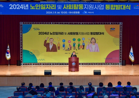 지난 9일 오전 여수문화홀에서는 읍면동 및 노인일자리사업 지원기관인 여수시니어클럽 등 9개 수행기관에서 일자리 대상자로 선정된 350여명의 어르신들이 참석한 가운데 노인일자리 및 사회활동 지원사업 통합발대식이 열렸다.