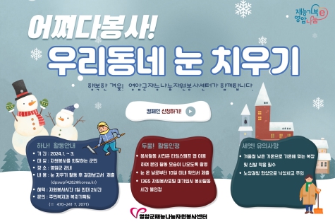 눈 치우기와 자원봉사를 결합한 이번 캠페인은, 영암군민의 참여로 눈 피해 최소화, 생활 불편 해소, 보행자 안전 확보 등을 모색하는 활동.
