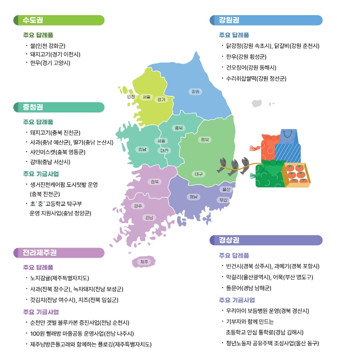 답례품별 구매액 비중은 농·축산물(38.3%), 지역사랑상품권(26.0%), 가공식품(24.5%), 수산물(7.3%) 등 순이다. 답례품의 제공자는 주로 농어민과 중소기업인데 답례품 제공과 판매가 지역의 생산자와 전국의 기부자를 직접 연계함으로써 지역경제 활성화에 기여했다.