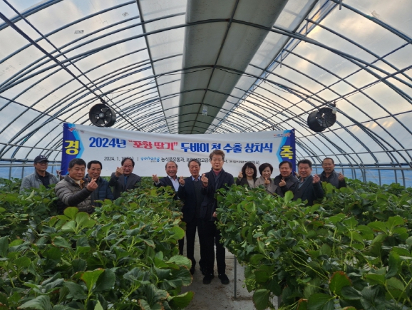 ![]() 포항시는 10일 두바이로 떠나는 딸기 수출 상차식 전 딸기 생산 농가에서 기념촬영을 하고 있다. |