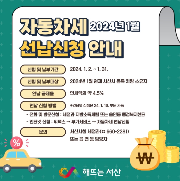 자동차세 연납 신청·납부 기간은 이번 달 31일까지로 서산시 세정과 및 읍면동 행정복지센터에 방문 또는 전화로 신청할 수 있으며, 위택스 홈페이지 또는 스마트 위택스 앱 온라인에서도 신고 · 납부가 가능하다.