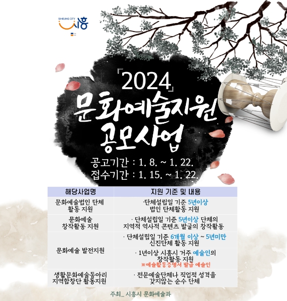 ![]() 시흥시, 지역예술 활성화할 '2024년 문화예술지원' 공모사업 개시 |