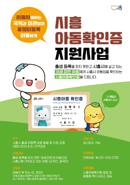 지난해 8월, 전국 최초로 ‘시흥시 출생 미등록 아동 발굴 및 지원 조례’를 제정하고, 출생등록을 하지 못해 보호와 권리의 사각지대에서 살아가는 아동에게 시흥시장이 ‘시흥아동확인증’을 발급해 필요한 행정적인 지원을 하고 있다.