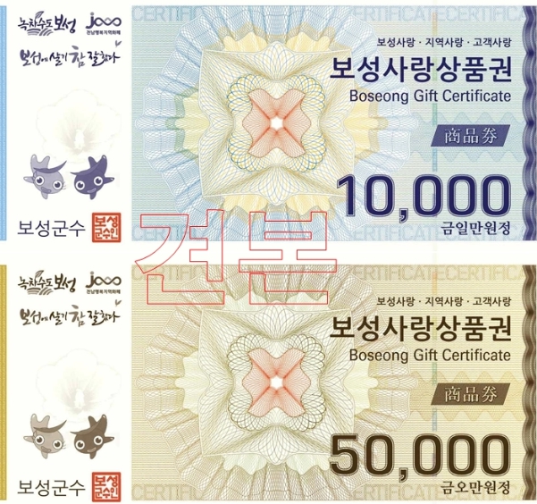 ‘보성사랑상품권’은 지류형 상품권 2종류(1만 원권, 5만 원권)와 카드형 상품권이 있으며 올해 303억 원(지류형 183억 원, 카드형 120억 원)의 보성사랑상품권을 발행했다.