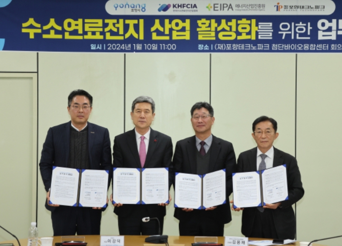 포항시는 10일 한국수소연료전지산업협회, 에너지산업진흥원, (재)포항테크노파크와 함께 ‘수소연료전지 산업 활성화를 위한 업무협약’을 체결했다.