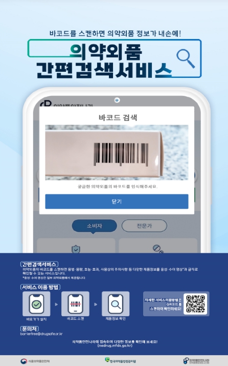 ‘식의약 규제혁신 2.0’ 디지털 안전관리 혁신의 일환으로 지난해 12월 26일부터 시작된 ‘의약외품 모바일 간편검색서비스’는 스마트폰으로 의약외품에 표시된 바코드를 인식(스캔)하면 해당 품목의 안전정보를 글자·음성·수어영상으로 제공하는 서비스다.