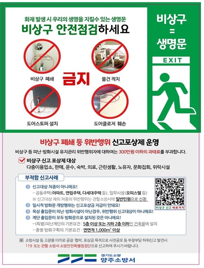 ![]() 양주소방서, 비상구 폐쇄 등 불법행위 신고포상제 운영 |