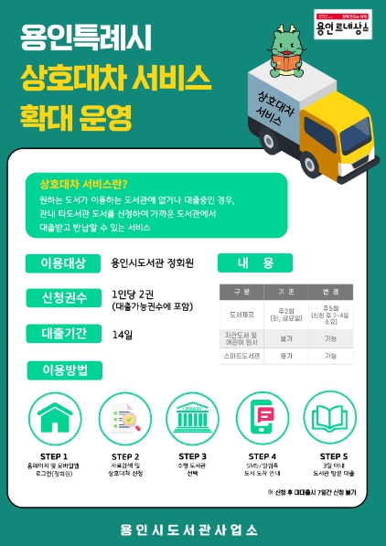 상호대차 신청은 용인시 도서관 홈페이지와 모바일앱(용인시도서관앱)을 통해 1인당 2권씩 가능하다. 책이 도착했다는 안내문자를 받은 후 3일 이내에 찾고, 반납은 14일 이내에 하면 된다.