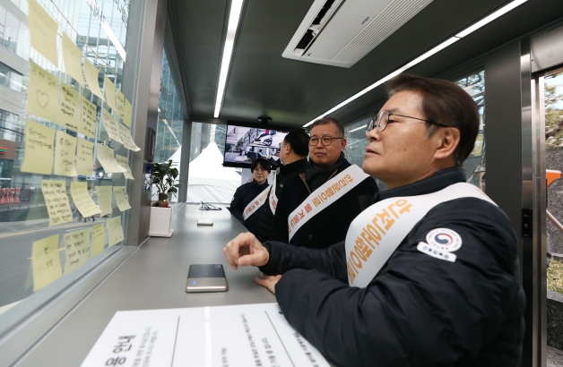 ![]() 강남구 이동노동자 쉼터를 방문한 이정식 고용노동부 장관(첫줄), 정헌재 강남구 부구청장(둘째줄) |