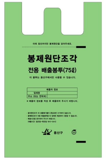 전용배출봉투는 투명한 초록색으로 기존 불투명 흰색 종량제봉투와 구분 가능하도록 제작했다. 또, 봉투 전면에는 배출 업체정보를 기재하도록 해 배출자가 책임 의식을 가지고 분리 배출할 수 있도록 ‘배출실명제’를 실시한다.