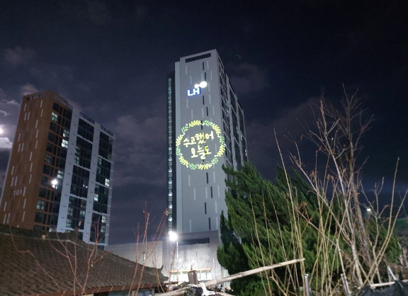 이번에 설치한 로고라이트는 홍보 효과를 높이기 위해 기존의 바닥 이미지 투영이 아닌 건물 외벽에 직경 10m의 홍보문구를 투영했다.
