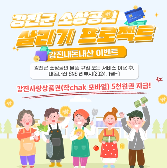 소상공인 살리기 프로젝트는 강진관내 소상공인 업체에서 1만원 이상 물품 구입 또는 서비스 이용 후, 영수증과 함께 개인 SNS에 게시해 온라인 플랫폼 및 마케팅이 어려운 관내 소상공인들에게 홍보와 매출 증대에 도움을 줄 수 있으며 누구나 참여가 가능하다.