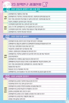 주제발표인 △강원특별자치도형 교육자치 분권 추진을 위한 중장기 과제발굴(협성대 김성기 교수)을 시작으로, △교육자치 △교육과정 △정책진단 △학생성장 △적극행정을 주제로 한 연구 결과를 발표했다.
