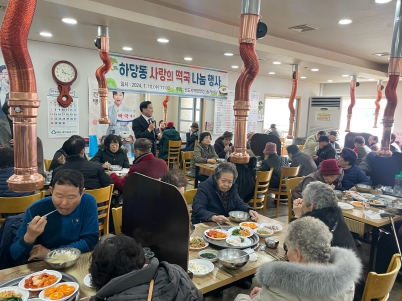 이날 떡국 나눔 행사에는 고기 고명과 지단을 곁들인 맛있는 떡국과 편육, 떡, 과일 등으로 차려진 점심을 어르신들에게 대접했으며, 하당동 새마을부녀회와 지역사회보장협의체 및 통장단을 비롯한 자생조직 회원들과 동 직원들이 함께 봉사활동에 참여했다.
