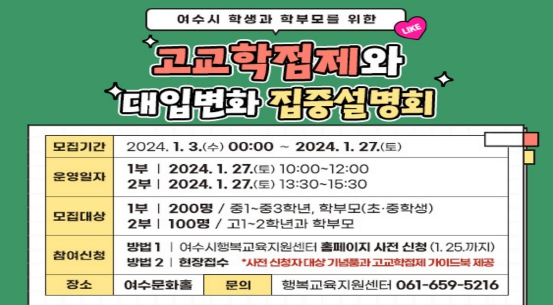 ![]() 여수시가 오는 27일 토요일 여수문화홀에서 관내 학생과 학부모를 대상으로 ‘2025 고교학점제와 2028 대입개편 집중설명회’를 개최한다. |