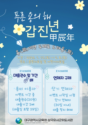 ![]() 대구삼국유사군위도서관, 갑진년 푸른 용의 해 맞이 대출 이벤트 실시 |