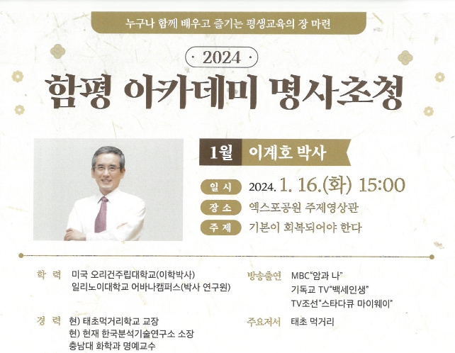 함평군은 “2024년도 ‘함평아카데미’가 오는 1월 16일 오후 3시에 함평 엑스포공원 주제영상관에서 개최된다“고 12일 밝혔다.