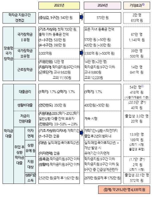 ④ (학자금 지원구간 경곗값) 올해 기준중위소득(보건복지부 고시)이 전년 대비 6.09% 인상(4인 가구 기준 2023년 540만 원 → 2024년 573만 원)됨에 따라, 2024년 학자금 지원구간 경곗값도 상향 조정된다. 이로 인해 약 2만 명 대학생에게 국가장학금 등 학자금 지원 혜택이 확대될 것으로 보인다.