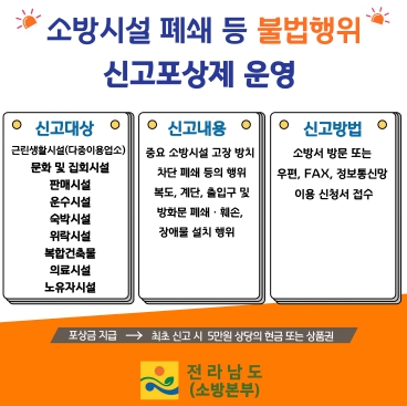 ![]() 전남소방, ‘소방시설 폐쇄 등 불법행위 신고포상제, 연중 운영 |