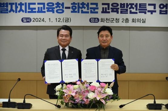 화천군과 도교육청, 한림대는 12일 화천군청에서 최문순 군수, 신경호 도교육감, 김종녀 군교육지원청 교육장 등이 참석한 가운데 ‘교육발전특구 시범사업 운영을 위한 협약식’을 개최하고, 서로 서명한 협약서를 교환했다.