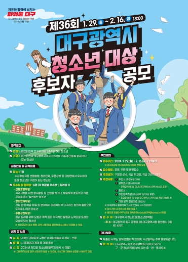 후보자 추천을 희망하는 기관은 대구광역시 홈페이지 공고문을 참고해 추천 서류 등을 대구광역시 청소년과(☏803-5872)에 1월 29일부터 2월 16일까지 공문, 우편 또는 방문으로 제출하면 된다. 수상자는 5월에 개최 예정인 제12회 청소년문화축제에서 시상할 예정이다.