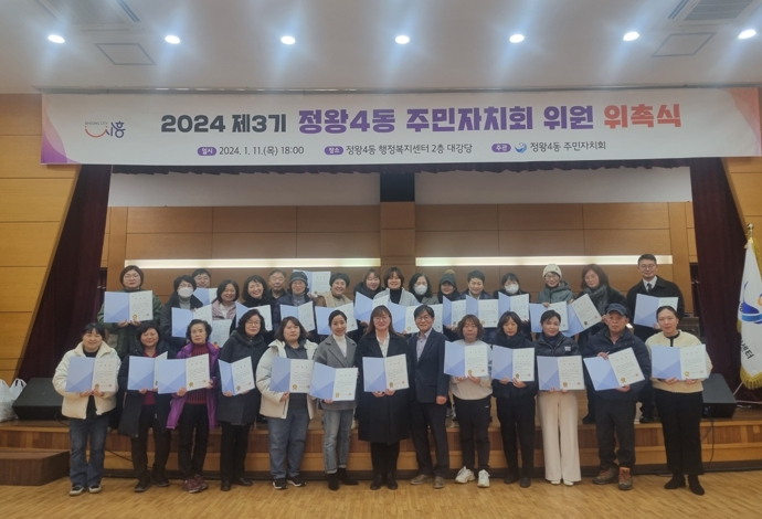 정왕4동 제3기 주민자치회는 지난해 11월 위원 공개모집을 시작으로 주민자치 교육 이수, 위원선정위원회의 심사를 거쳐 30명의 위원으로 구성됐다. 2024년 1월부터 2년간 자치계획 수립, 주민 숙원사업 추진, 주민총회 개최 등 다양한 활동을 수행할 예정이다.
