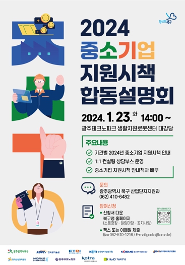 이번 설명회에는 북구를 비롯해 ▲광주테크노파크 ▲중소벤처기업진흥공단 ▲한국산업단지공단 ▲한국전자통신연구원 ▲한국전자기술연구원 ▲한국광기술원 ▲한국발명진흥회 ▲연구개발특구진흥재단 ▲KOTRA광주전남지원단 ▲기술보증기금 등 12개 기관이 참여해 기관별 다양한 중소기업 지원시책 설명이 진행된다.