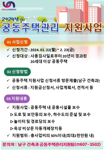 지원 신청은 1월 22일부터 2월 23일까지 남구청 건축과 공동주택관리지원팀으로 하면 되고, 신청단지를 대상으로 현장조사 후 공동주택관리 심의위원회의 심의를 거쳐 대상 단지를 선정해 통보할 예정이다.