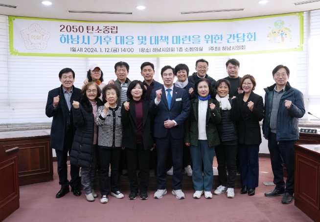 ![]() 1월 12일 하남시의회가 주최한 ‘2050 탄소중립, 하남시 기후 대응 및 대책 마련을 위한 간담회’에서 의원들과 참석자들이 탄소중립 의지를 다지며 기념사진을 하고 있다. (사진_하남시의회 제공) |