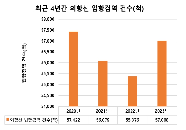 한편, 선박 중 검역관이 탑승하여 선박 내 보건상태(환자나 사망자, 빈대 등 감염병 매개체 여부) 또는 위생상태를 확인하게 되는 승선검역 대상 선박수도 2020년(22,190척) 이후 하락하다가, 2023년 19,028척으로 반등하는 동일한 흐름을 보였으며, ’23년 11월 승선검역을 통해 빈대 유입 2건 등 위생해충을 발견한 바 있다.