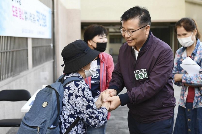 ![]() 류경기 중랑구청장이 어르신의 손을 맞잡으며 안부를 건네고 있다. |