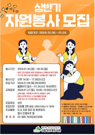 ![]() 은평구 은뜨락도서관, 상반기 자원봉사 모집 포스터 |