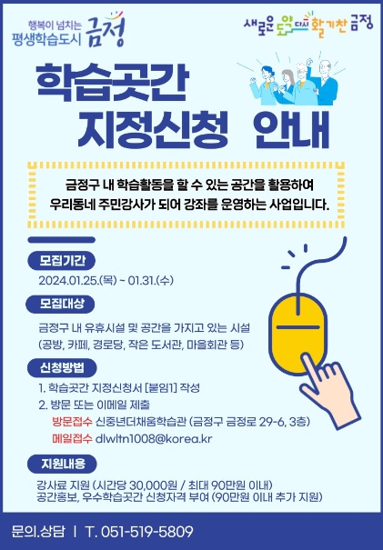 ![]() 부산시 금정구, 나도 우리동네 주민강사! 마을 배움터 ‘학습곳간’으로 오세요 |