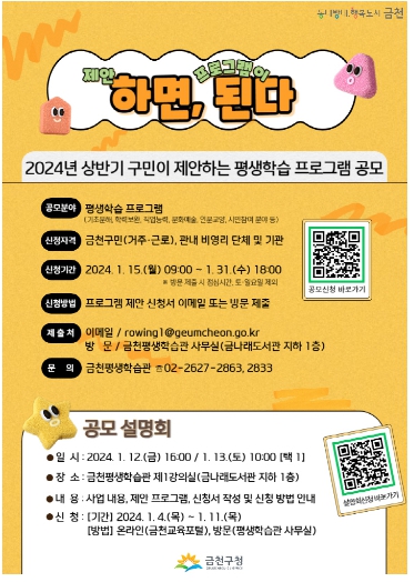 공모는 1월 15일부터 1월 31일까지 진행되며 공모분야는 기초학력교육, 학력보완교육, 직업능력교육, 문화예술교육, 인문교양교육, 시민참여교육 6개이다. 신청자격은 구민, 금천구 소재 직장인 및 금천구 내 비영리단체와 기관이다. 응모방법은 금천교육포털에서 신청서를 내려받아 이메일 또는 금천평생학습관에 방문하여 신청서를 제출하면 된다. 응모된 프로그램은 심사를 거쳐 10여개를 선정해 3월부터 금천평생학습관에서 운영된다.
