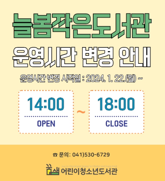 그러나, 늘봄작은도서관 이용자가 ▲하루평균 6명 ▲연간 도서 대출이 전년 대비 약 19% 감소하면서, 유사 작은도서관 이용률(전년 대비 46% 증가추세)과 격차를 보여, 효율적인 운영이 요구됐다. 당초 매주 월요일~금요일, 09시~18시까지 운영됐으나, 오는 1월 22일부터 운영시간을 14시~18시로 변경‧운영하게 된다.