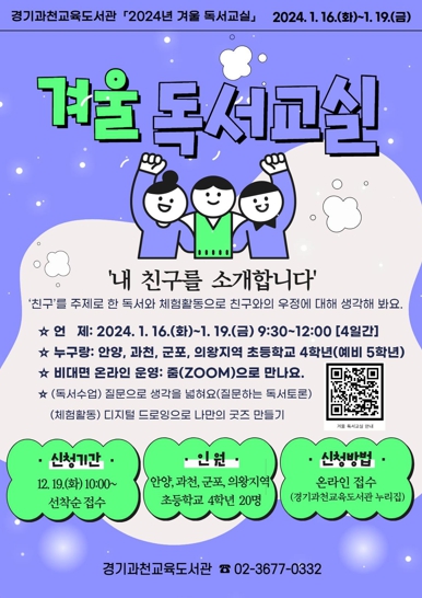 조정수 경기과천교육도서관장은 “책 읽기, 독서토론 등 책을 매개로 한 소통과 창작활동으로 알찬 방학을 보내길 바란다”며 “어린이들의 올바른 독서 습관 형성과 책 읽는 사회 분위기 조성을 위해 노력하겠다”고 말했다.