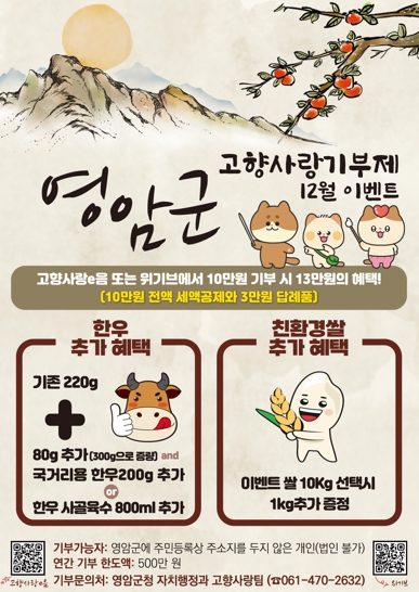 나아가 영암군은 답례품 업체들과 간담회를 열고, 협의를 거쳐 12월 기부제 연말 이벤트로 특산품 추가 증정을 실시했다.