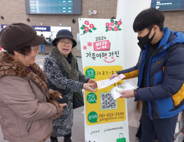 ![]() 강진군문화관광재단 직원이 나주역에서 강진 반값 여행 홍보물을 나눠주고 있다. |