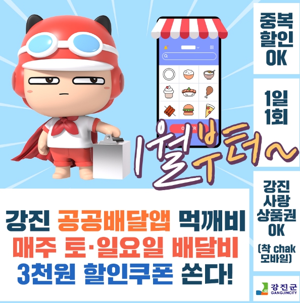 ![]() 강진 공공배달앱 먹깨비 주말 배달비 3,000원 할인쿠폰 홍보 리플릿. |