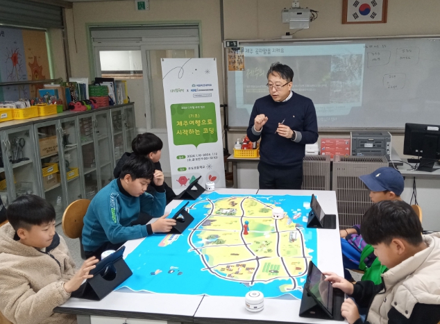캠프에 참가한 3~5학년 학생들은‘제주 여행으로 시작하는 코딩’이라는 주제로 순차구조 개념에 대해서 이해하고 로봇의 순차 제어를 통해서 나만의 제주 여행을 실시했다. 그리고 제주 환경에 대해 함께 생각해보는 디자인씽킹 활동과 친환경 제품을 디자인한 후 코딩 활동을 통해서 효율적으로 동작을 시킨 후 지속가능한 발전을 위한 방안들도 생각해보았다.