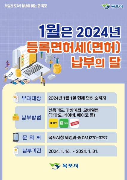 ![]() 목포시가 2024년 정기분 등록면허세(면허)를 부과했다. / 목포시 제공 |