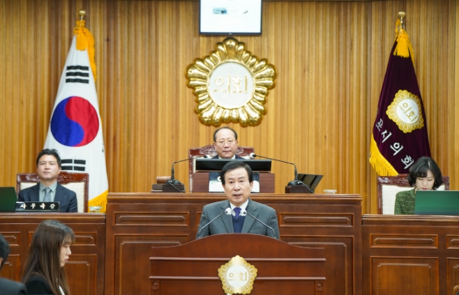 ![]() 박홍률 목포시장이 2024년 첫 목포시의회 임시회에서 시정 업무보고를 하고 있다. / 목포시 제공 |
