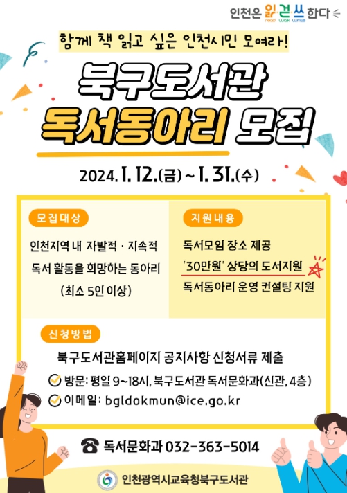 인천에 소재를 두고 월 1회 이상 활동하는 5인 이상의 독서동아리를 대상으로 자발적이고 지속적인 독서활동에 필요한 토론 공간 제공과 30만 원 상당의 활동 도서를 지원한다. 또한 신규독서동아리 역량 강화를 위한 컨설팅 특별 프로그램도 운영할 예정이다.