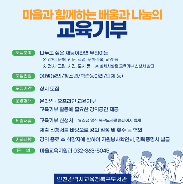 북구도서관 관계자는 “교육기부를 통해 개인의 지식, 경험, 재능 등을 지역사회와 공유함으로써 건강한 마을교육 생태계를 조성하고, 지역사회의 교육활동 참여기회도 확대되길 희망한다”고 말했다.