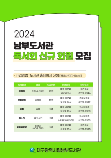 ![]() 대구남부도서관, 2024년 독서회 신규 회원 모집 |